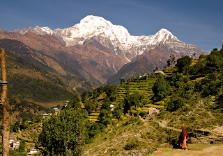 We stop for lunch in the town of Pothana which offers some good views of Fish Tail. We also hike about 1 mile (1.5 Km) up behind the town to get even better views of the Annapurna Mountain Range. It’s a bit hazy so I’m unable to get any really clear pictures but, you get a great view.